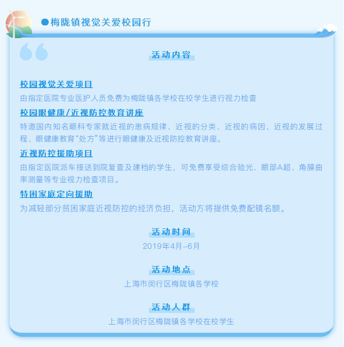 本次活动将通过为梅陇镇幼儿园及中小学的学生进行视力检测,普及爱眼、护眼知识,提倡青少年近视早预防、早发现、早治疗,并最终降低中小学生的视力不良率,提高中小学生视觉健康水平。