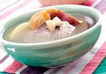 3、口蘑:口蘑泡开后洗净,泡蘑菇水澄清待用;豆腐切长条形,用开水烫后捞出沥水。锅内放鲜汤及泡蘑菇水烧开,放入口蘑、豆腐、火腿末、豌豆,加盐,炖煮约10分钟,勾芡,调入味精,淋少许麻油。